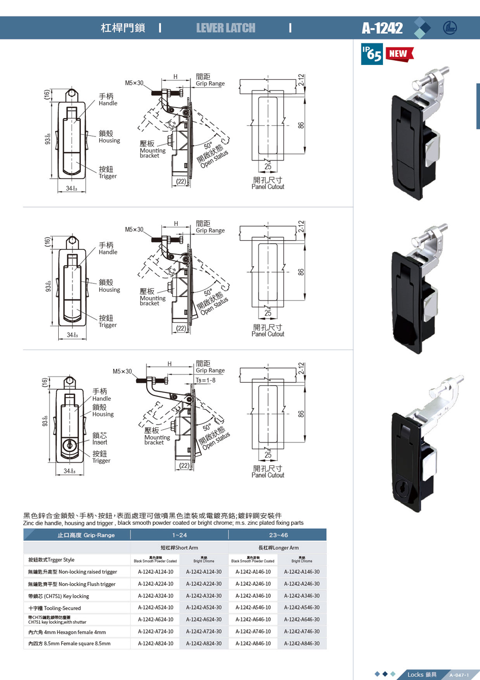槓桿式門鎖是利用槓桿結構開啟與鎖緊的門鎖機構,透過壓縮力將門迫緊,確保門板密封防震,更不會磨損到門框,藉由調整螺絲改變夾緊範圍和夾緊力。