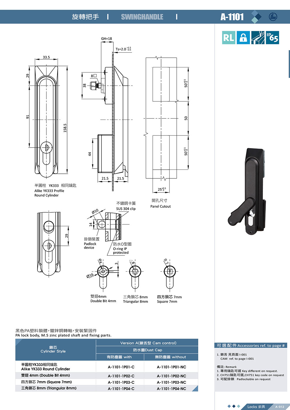 旋轉把手鎖常用於機櫃、配電櫃、控制箱等工業設備。 這款把手鎖可以搭配多種鎖芯類型,例如:
