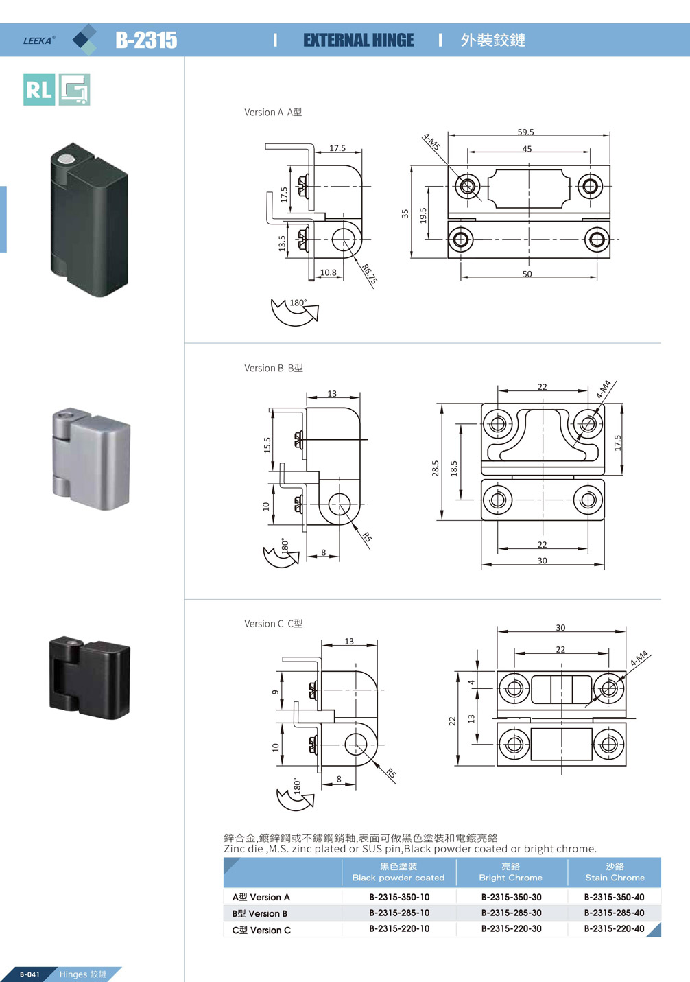 鋅合金,鍍鋅鋼或不鏽鋼銷軸,表面可做黑色塗裝和電鍍亮鉻