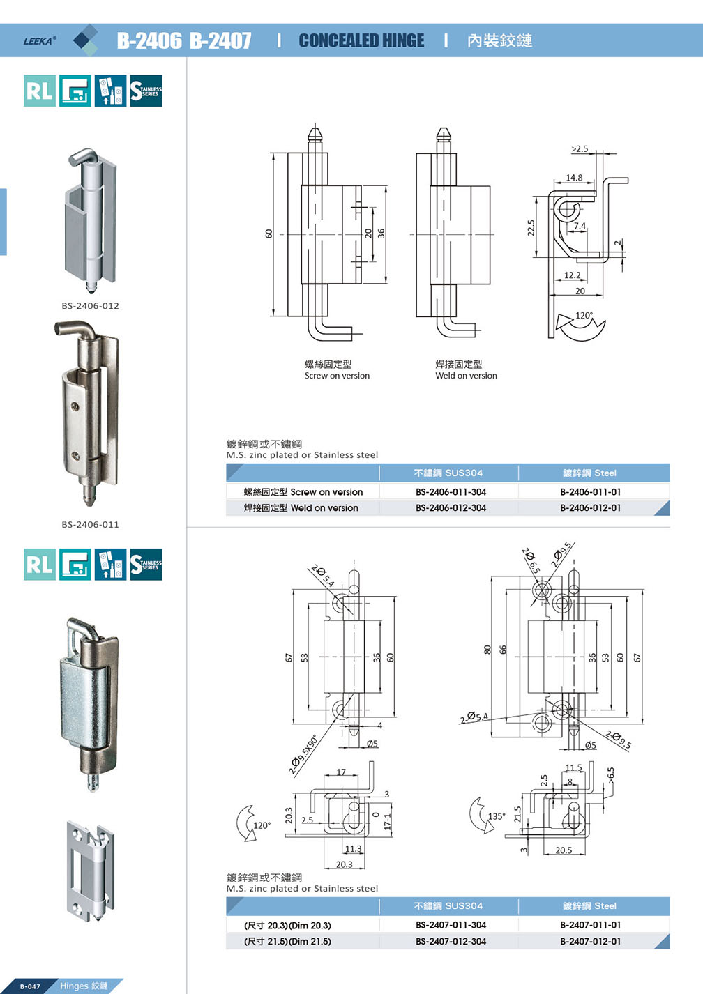 - 鍍鋅鋼:B-2407-011-01(20.3mm),B-2407-012-01(21.5mm)