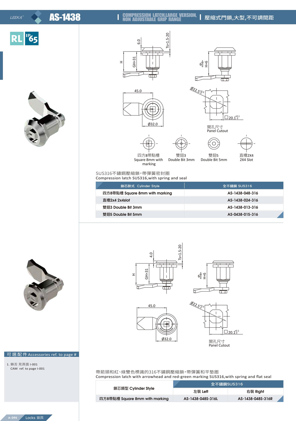 防水不鏽鋼 316 壓縮式門鎖-大型,固定間距,左裝、右裝兩種可選擇。