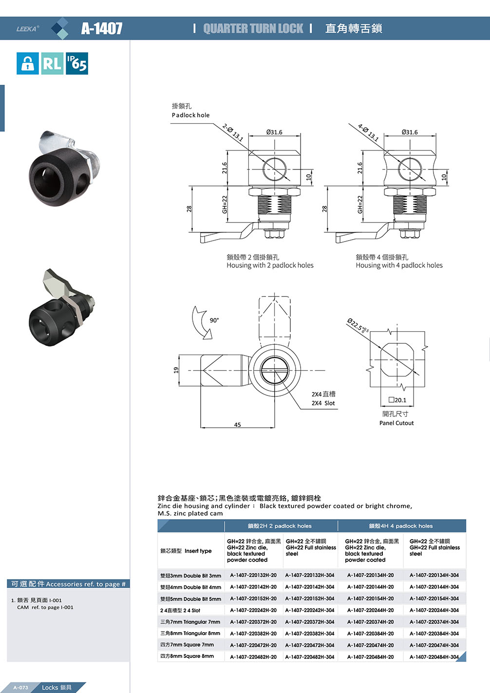 A-1407-2H 按壓式直角轉舌鎖