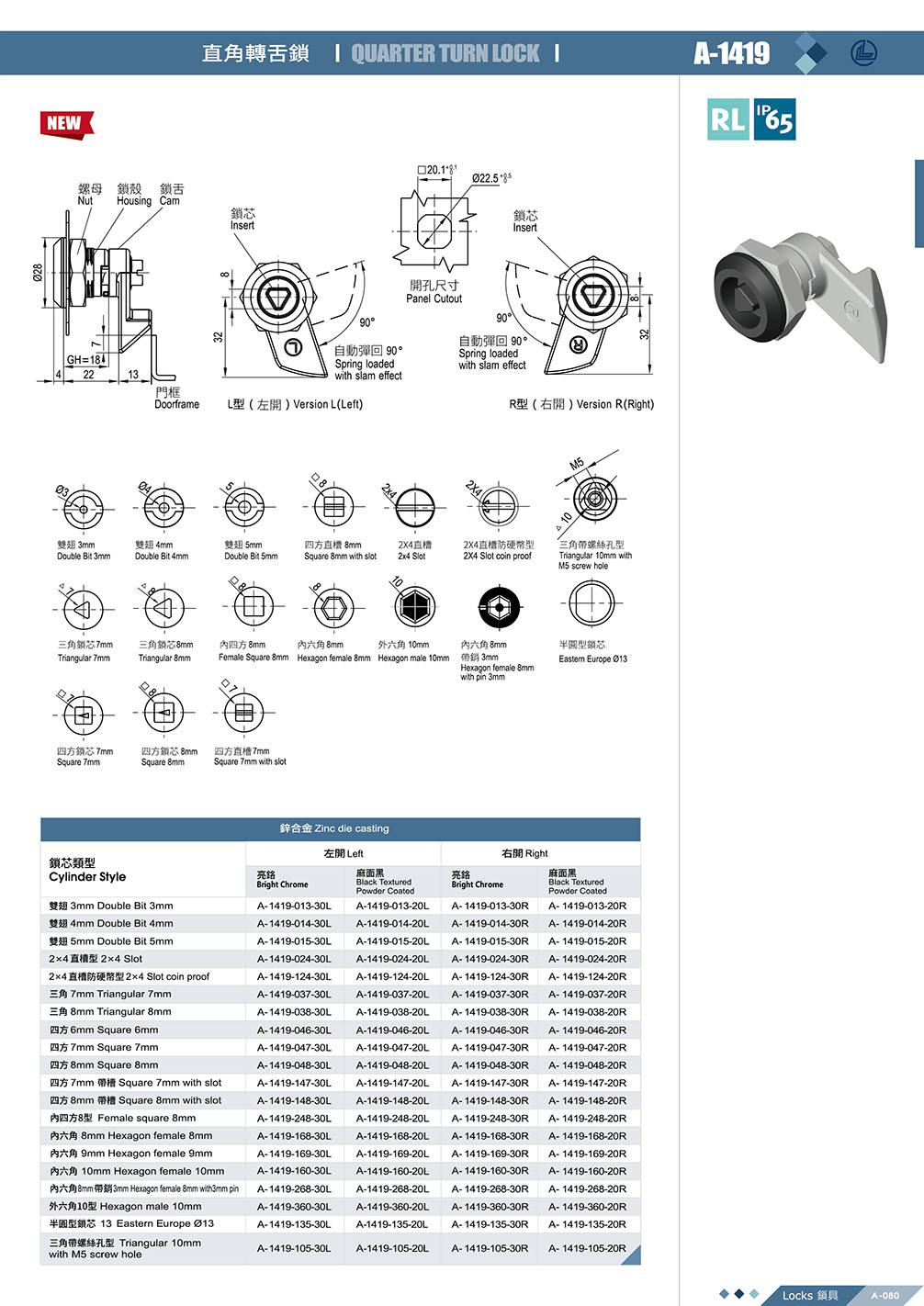產品特色- 開啟方式:用工具鑰匙旋轉鎖芯 90°(四分之一轉)即可開門,放開鑰匙鎖舌會自動彈回 90°(彈簧復位)。